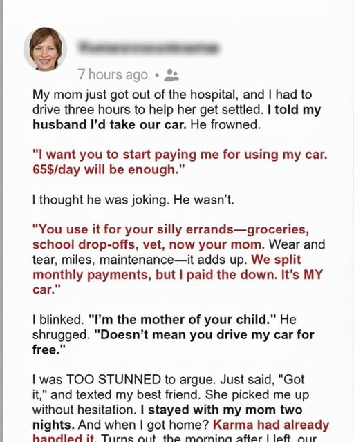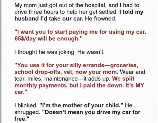 When my mom had a stroke, I planned to spend three days helping her adjust at home. I asked my husband, Liam, if I could take the car we shared every day. Without looking up from his phone, he said, “Sure—$65 a day.” In that moment, I didn’t feel like his wife or the mother of his child, just a stranger renting space. I quietly called my friend Jess to drive me instead and left the next morning without another word. As I sat in the car watching our home fade from view, I wondered when my marriage had stopped being a partnership.