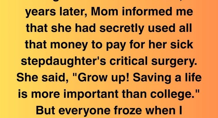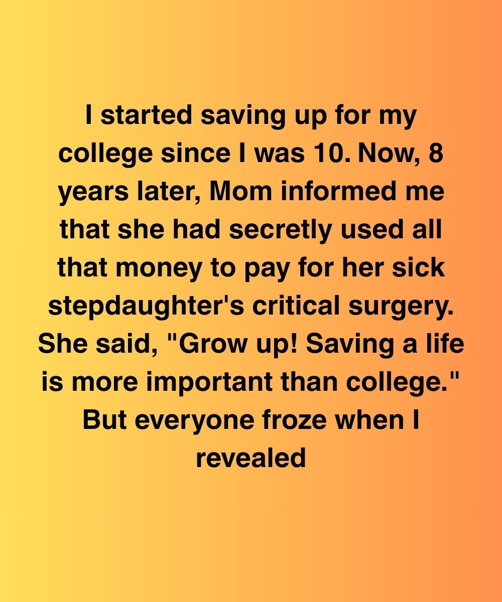 I started saving up for my college since I was 10. Now, 8 years later, Mom informed me that she had secretly used all that money to pay for her sick stepdaughter’s critical surgery. She said, “Grow up! Saving a life is more important than college.” But everyone froze when I revealed…that I already knew about the surgery—and I had been planning to help, just not like this. You see, my stepsister, Emma, is only seven. She has always been quiet, with big eyes that follow me like I’m some kind of superhero.