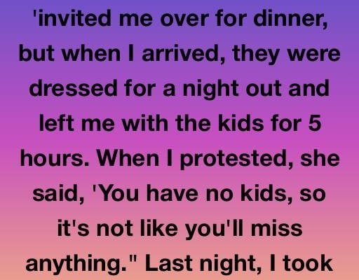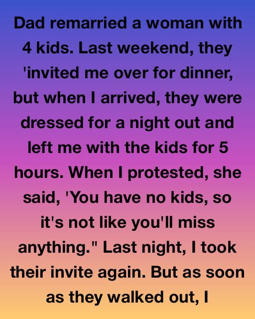 Dad remarried a woman with 4 kids. Last weekend, they “invited me over for dinner,” but when I arrived, they were dressed for a night out and left me with the kids for 5 hours. When I protested, she said, “You have no kids, so it’s not like you’ll miss anything.”