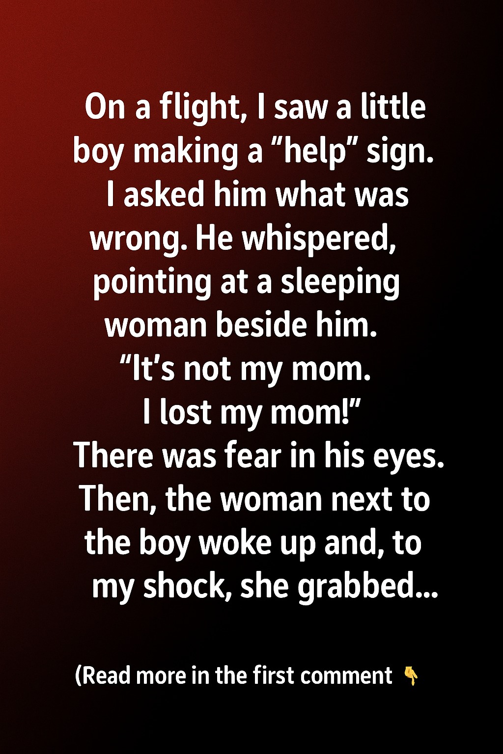 On a quiet flight, clouds drifting like soft cotton outside the window, a traveler noticed a little boy signaling for help with trembling hands. Concerned, they leaned in and gently asked what was wrong. The boy whispered, pointing at the woman beside him, “She’s not my mom… I can’t find my mom.” His eyes shimmered with worry and uncertainty. The traveler’s heart softened instantly, recognizing the boy’s need for comfort and support.