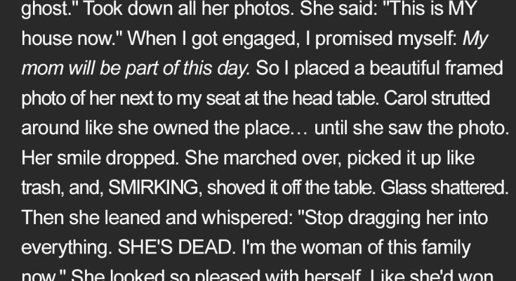 When Carol knocked over my late mom’s photo at my wedding, she thought she’d ruined my big day. She stood there smiling, certain I would crumble. But she had no idea what was about to happen next. I’m 27, and my mom passed away when I was 19. She wasn’t just my mother—she was my best friend and hero. Losing her was devastating, and for a long time, I didn’t know how to cope.