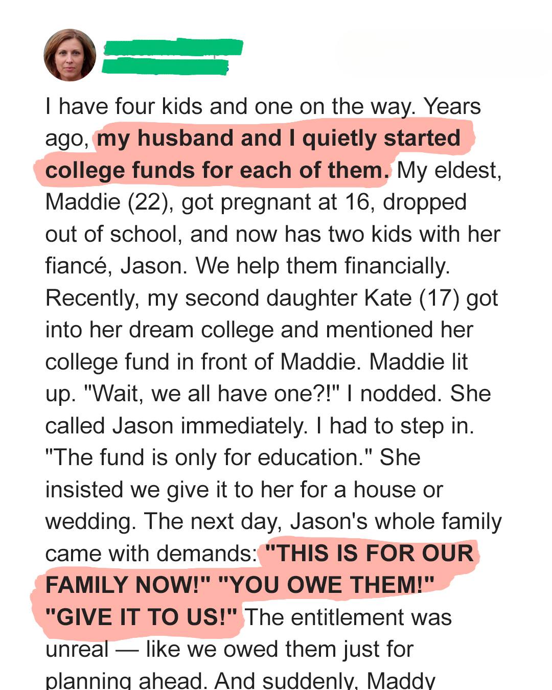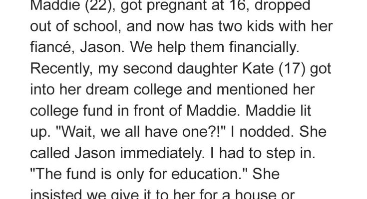 Recently, Maddie’s younger sister Kate got accepted to her dream college. While visiting Maddie, Kate mentioned her college fund. Maddie was shocked to learn she had one too and immediately assumed she could use it for a house or wedding. When I explained that the money was meant only for education, she became upset. Soon after, her fiancé Jason and his family started calling, demanding the money outright as if we owed it to them. Their entitlement was heartbreaking, especially when they began pressuring Maddie.