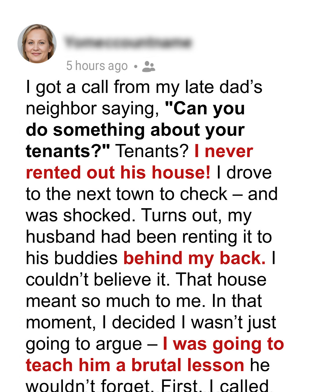 I got a call from my late dad’s neighbor saying, “Can you do something about your tenants?” Tenants? I never rented out his house! I drove to the next town to check – and was shocked. Turns out, my husband had been renting it to his buddies behind my back. I couldn’t believe it. That house meant so much to me. In that moment, I decided this wasn’t something I could ignore. It wasn’t just about the house—it was about trust.