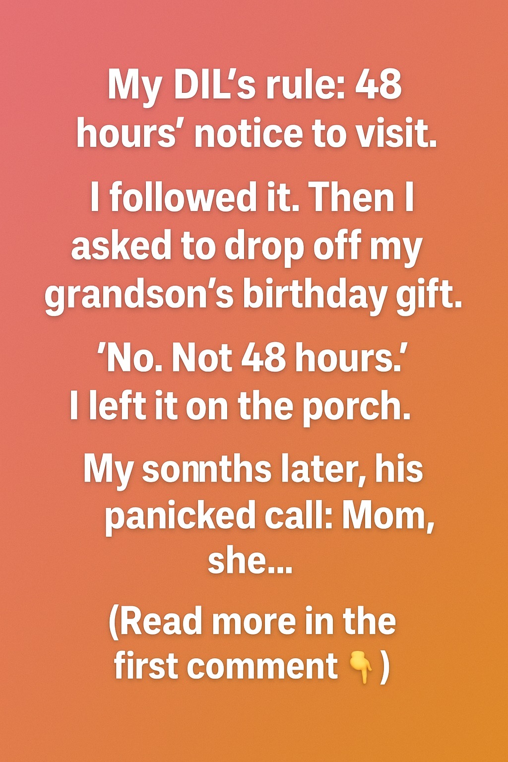 My daughter-in-law had one rule — 48 hours’ notice before visiting. I respected that, even though it sometimes stung. When my grandson’s birthday came around, I simply asked if I could drop off his gift. She reminded me of the rule again, so I quietly placed the wrapped present on their porch, smiled at the security camera, and drove home. I promised myself I would never let pride get in the way of loving my family — even from a distance.
