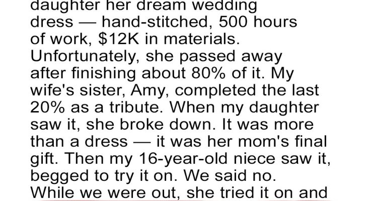 My late wife spent 500 hours hand-sewing the perfect wedding dress for our daughter. It cost $12,000 and was her final act of love before she passed away. Last week, my 16-year-old niece destroyed it in minutes.