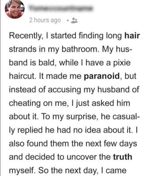 To my surprise, he seemed just as confused as I was. He shrugged and said he had no idea where the hair came from. His relaxed tone eased my mind a little, but when the strands appeared again over the next few days, I knew I had to get to the truth.Determined to solve the mystery, I paid close attention to everything happening in the house. Then one afternoon, as sunlight streamed through the bathroom window,
