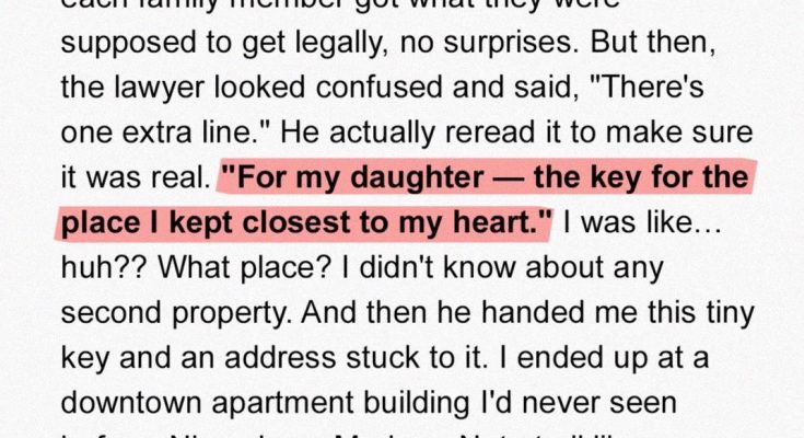 My dad passed away a few months ago, and settling everything was simple and peaceful. He never owned much, and the will had no surprises—everyone received exactly what they expected. But the lawyer paused, looking puzzled, and read one last unexpected line: “For my daughter — the key to the place I kept closest to my heart.” Confused, I took the tiny key and address he handed me. Soon, I found myself standing in front of a modern downtown apartment building, completely unlike anything connected to my dad. My heart raced as I unlocked the door, unsure of what I was about to discover.