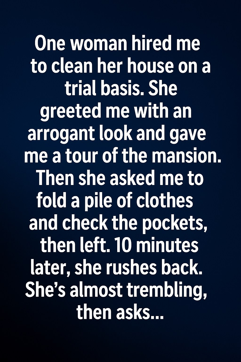 One woman hired me to clean her grand home on a trial basis. She greeted me politely, but there was a sense of distance, as if she expected disappointment. After a short tour, she left me with a neat stack of clothes to fold and asked me to check the pockets. I worked quietly, grateful for the opportunity and determined to do my best. The house was calm, filled with soft light and quiet expectations.