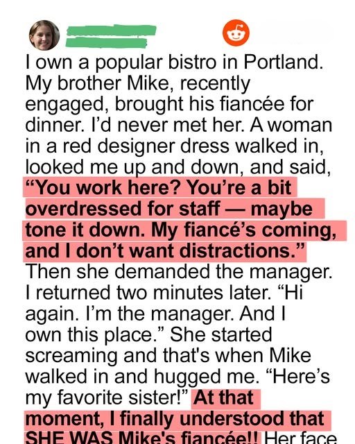 Moments later, I walked back to her table—not as a server, but as the owner. When I placed my business card in front of her and introduced myself properly, her confident expression crumbled instantly. Just then, my brother walked in, smiling as he hugged me and introduced his fiancée. To my shock, it was the same woman who had just tried to belittle me. Her face drained of color as she realized who I was—not only the restaurant owner, but also her future sister-in-law.