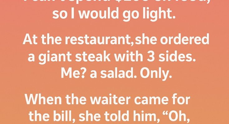 My friend invited me to a fancy steakhouse, and I mentioned beforehand that I was on a tight budget. I planned to order something small and simply enjoy the evening together. She ordered a large entrée with multiple sides, while I chose a simple salad. When the bill arrived, she confidently told the waiter, “We’ll split it evenly.” I smiled calmly, knowing I already had a plan.