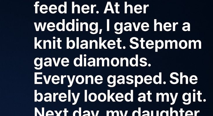 My ex’s new wife always bought my daughter expensive gifts — the latest phone, designer clothes, fancy jewelry. I worked two jobs just to keep food on the table, but I never complained. Love, not luxury, was what I wanted my child to remember. When my daughter got married, I spent months knitting a soft blanket with my own hands. It wasn’t glamorous, but every stitch carried a piece of my heart. At the wedding, her stepmother presented her with a sparkling diamond set. The guests applauded. My simple blanket looked out of place beside it.