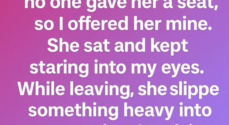 As the bus reached her stop, she stood up slowly and steadied herself. Before stepping off, she gently slipped something into my coat pocket. I was surprised but didn’t react immediately. She smiled softly, as if sharing a quiet secret. After she left, I reached into my pocket and felt something small and cool. My curiosity grew, but I waited until I felt settled enough to take it out.