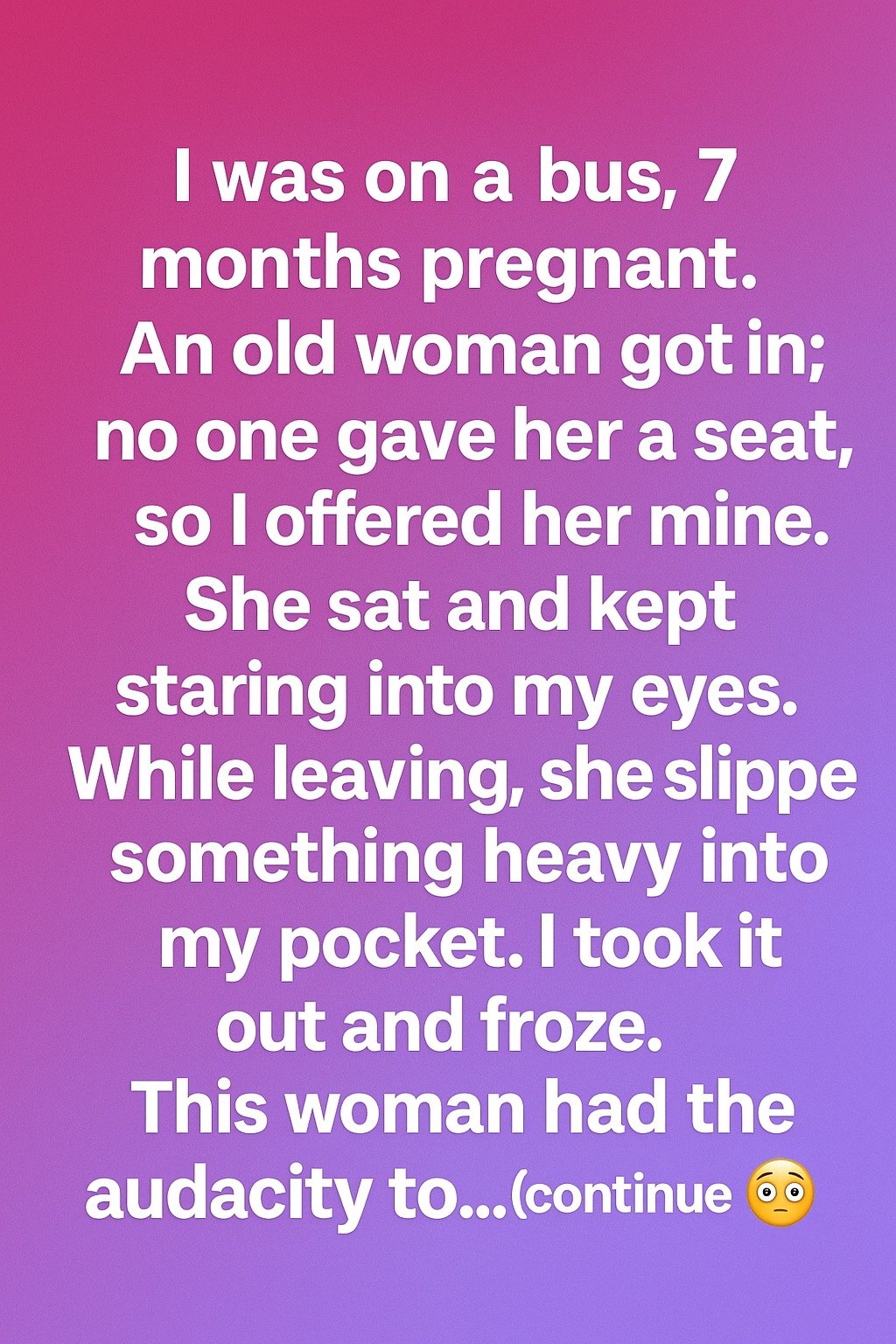 I was riding the bus, seven months pregnant and feeling both excited and tired. When an older woman boarded, I offered her my seat without a second thought. She sat down and kept looking at me, not in a strange way, but almost as if she saw someone she once knew. I simply smiled back, happy to help. Kindness felt natural in that moment.