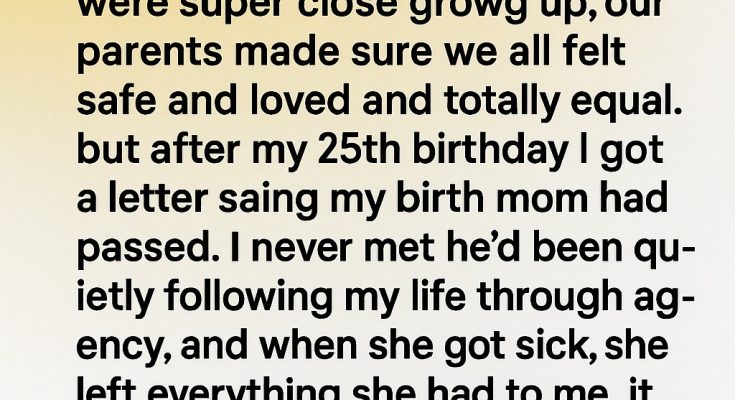 Growing up, I always believed I was one of the lucky ones. I was adopted as a baby by loving parents and later gained two adopted siblings, Brian and Kayla. We were told we were all “chosen” and equal, and for years, I believed it. On my 25th birthday, everything changed. I received a letter from a lawyer: my birth mother, Alina, had passed away and left me her entire estate — $187,000. I was overwhelmed with emotion and expected my family to support me.