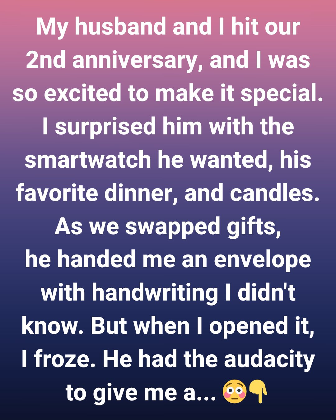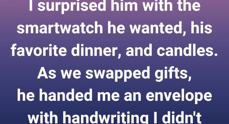 My husband and I hit our 2nd anniversary, and I wanted the day to feel unforgettable. I prepared his favorite dinner, lit candles, and surprised him with the smartwatch he had hoped for. When it was his turn to give me a gift, he handed me an envelope with unfamiliar handwriting.