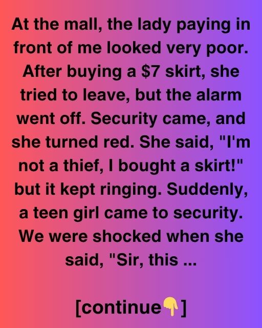 I was waiting in line at the mall when the woman in front of me finally paid for her $7 skirt and turned to leave—only for the security alarm to blare. She blushed furiously and protested, “I’m not stealing—I bought it!” The guards closed in, and she sank, mortified. Then a teenage girl in a rumpled school uniform stepped forward.