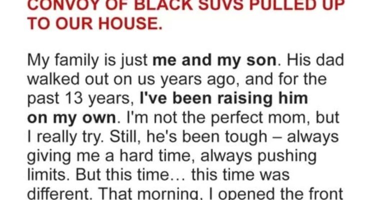The next morning, everything felt surprisingly calm until I heard several car doors close outside. When I opened the front door, I saw a group of neatly dressed people standing politely by a row of black SUVs. One of them gently held out a photo of my son and asked if he lived here. I nodded, unsure of what was happening or why they had come. Their expressions, however, were warm and reassuring.