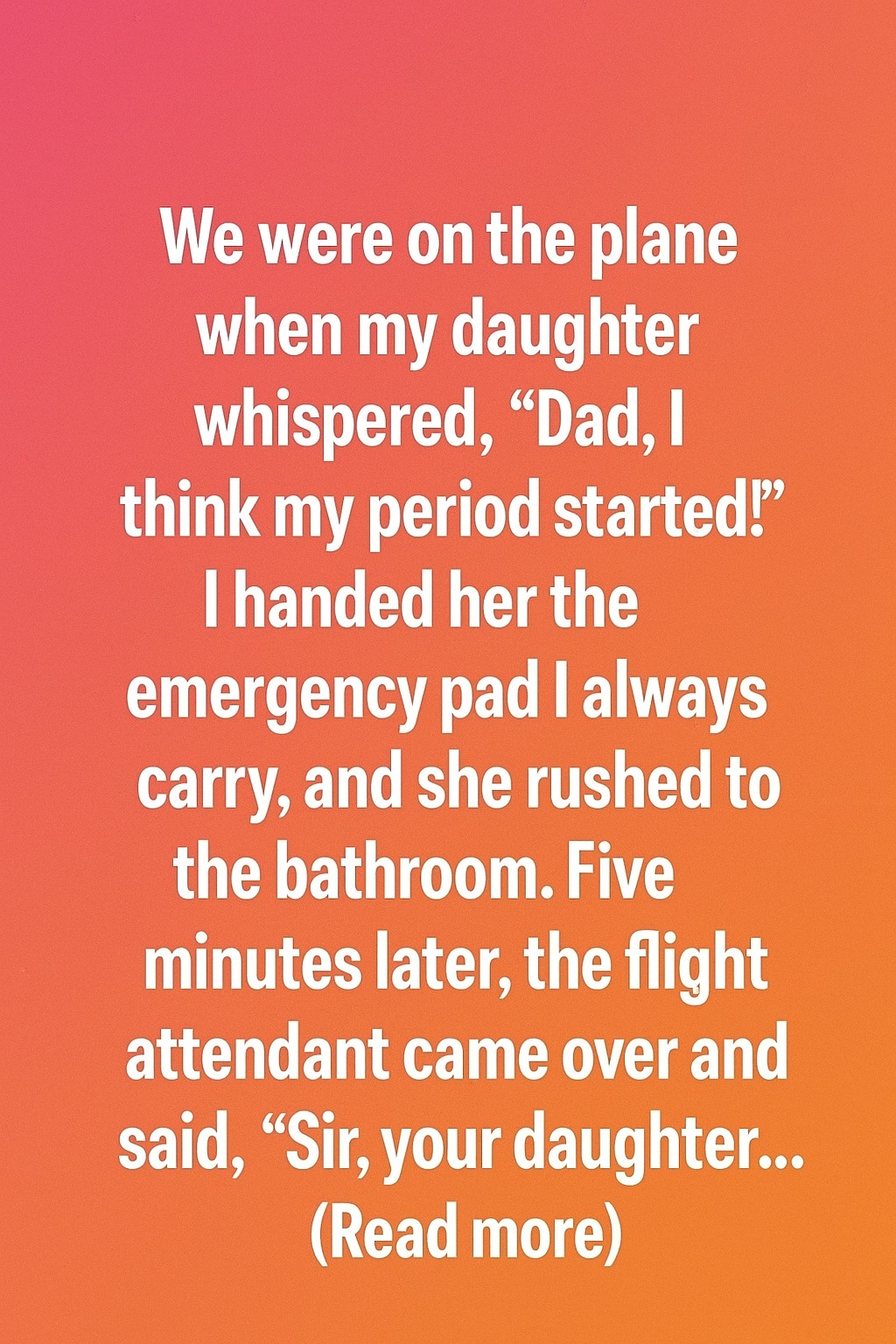 We were on the plane, halfway through our journey, when my daughter leaned close to me and whispered, her voice barely audible over the hum of the engines,“Dad, I think my period started.”For a second, her words hung in the air. I saw her eyes wide with panic and embarrassment, and my heart immediately ached for her. She was still so young, and I knew this was one of those moments that would stay with her forever. Without hesitation, I reached into my bag and handed her the emergency pad I always carry, just in case.