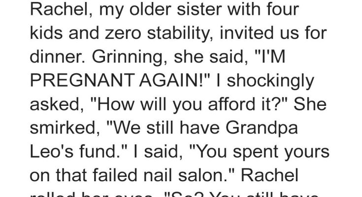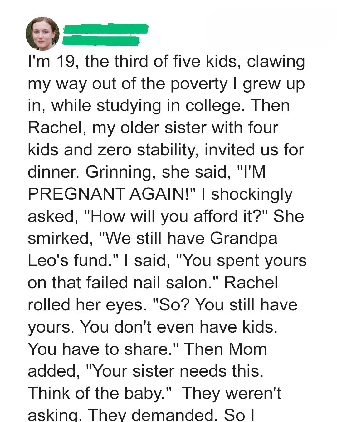 My older sister Rachel had already burned through her own share of the fund on a failed business and luxuries she couldn’t afford. At 27, pregnant with her fifth child, she made a shocking announcement during a family dinner: she wanted my portion of the college fund “for the baby.”