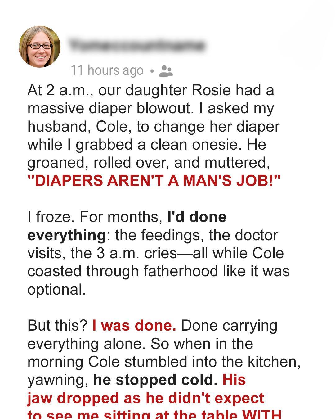 My husband, Cole, refused to change our baby’s diapers. “It’s not a man’s job,” he said, rolling over as I stood there, sleep-deprived and heartbroken, with our daughter wailing in the next room. That night, I didn’t argue.