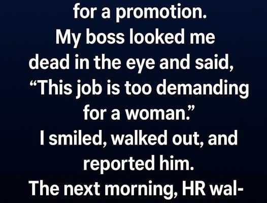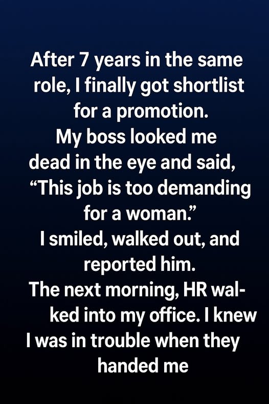 After seven years of dedication in the same role, I finally received news that I had been shortlisted for a long-awaited promotion. I walked into the meeting with hope, ready to show how far I had grown. Instead, my boss looked me straight in the eye and told me the job was “too demanding for a woman.” The words stunned me, but I kept my composure.