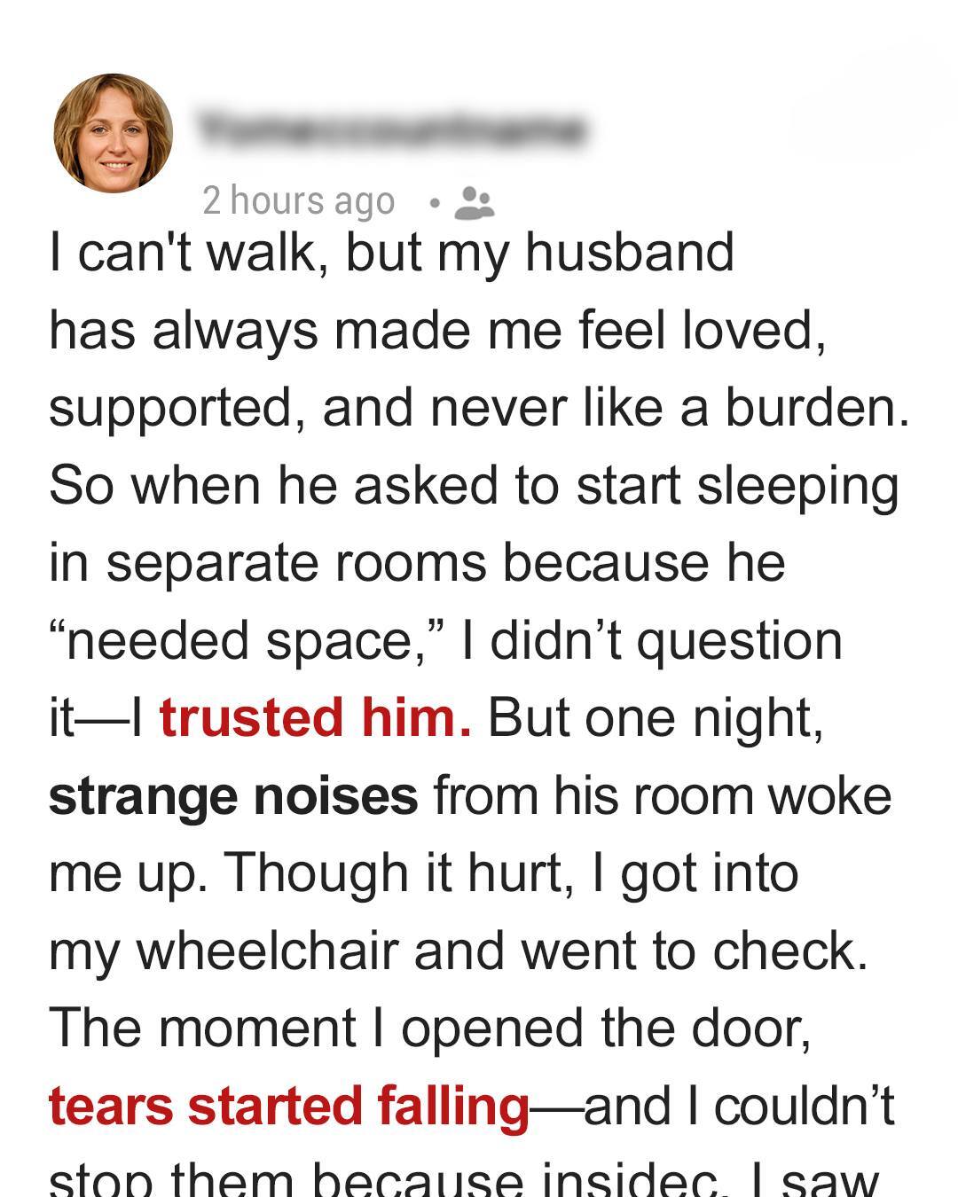 When my husband James said he wanted to sleep in a separate room, my heart broke. After five years of marriage and surviving a car accident that left me paralyzed, this felt like the beginning of the end. He claimed he just needed space to sleep better, but I couldn’t shake the feeling that I was becoming a burden.