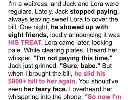 That night, Lora arrived late, looking exhausted. Jack barely acknowledged her and ordered like a king. When the bill came, Lora quietly refused.