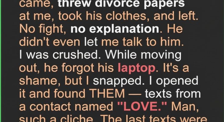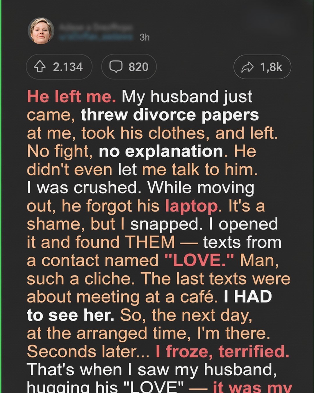 He left me. My husband just came, threw divorce papers at me, took his clothes, and left. No fight, no explanation. He didn’t even let me talk to him. I was crushed. While moving out, he forgot his laptop. It’s a shame, but I snapped. I opened it and found THEM — texts from a contact named “LOVE.” Man, such a cliché. The last texts were about meeting at a café. I HAD to see her. So, the next day, at the arranged time, I’m there. Seconds later… I froze, terrified.