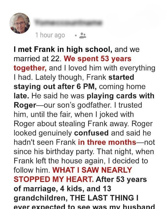 Frank and I spent more than five decades together, raising our children, cherishing our grandchildren, and building a life filled with shared experiences and memories. I always believed the foundation of our marriage was unshakable. But when Frank began coming home late and offering explanations that didn’t quite add up, a quiet unease started to settle in.