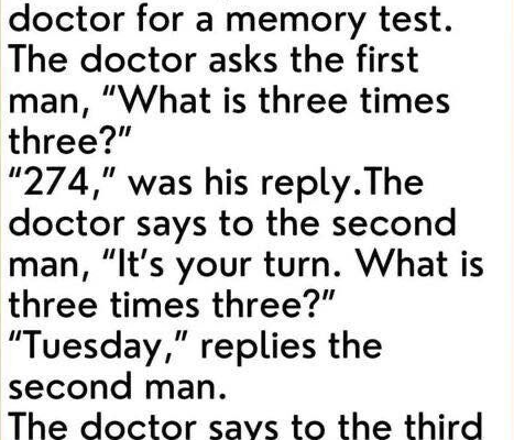 Three elderly men are at the doctor for a memory test. The doctor asks the first man, “What is three times three?” “274,” he proudly replies, convinced he has solved a great mystery. The doctor keeps a polite smile, jotting down a note while wondering how he arrived at such a number. Then he turns to the second man and asks the same question. “Tuesday,” the second man replies with equal confidence, as though he is certain arithmetic and calendars follow the same rules. Though amused, the doctor simply nods and prepares to question the third man, unsure of what to expect next.
