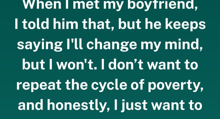 I’ve told him, very clearly, that I won’t. I don’t want to repeat the cycle of poverty, and honestly, I just want the chance to live for myself for once. We’re both working, and we’re barely covering our bills as it is.