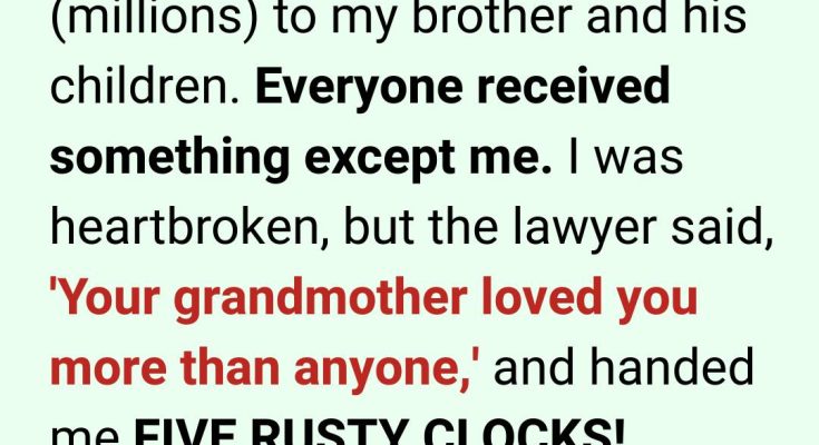 My brother snorted under his breath. The lawyer reached under the table and lifted a dusty box. Inside were five rusty clocks.