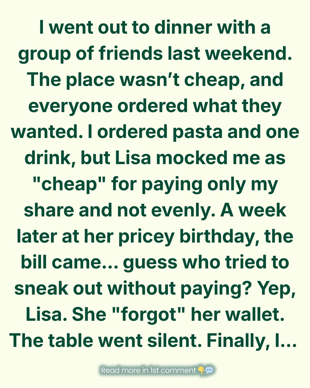 My cheeks burned, and the table fell into an awkward silence. I swallowed the sting, paid my share without arguing, and tried to brush it off — but inside, I felt humiliated. Fast-forward a week.
