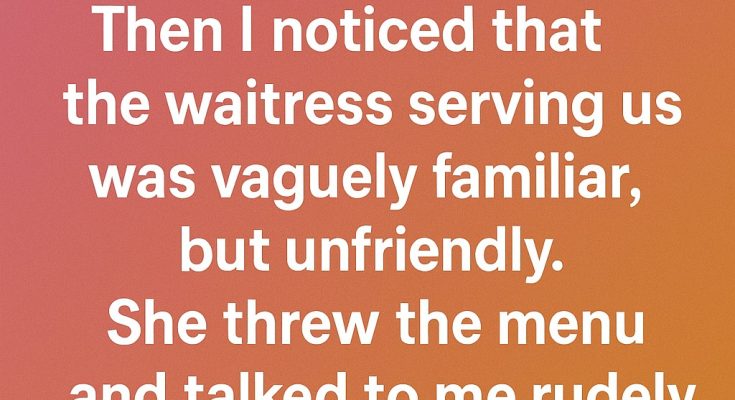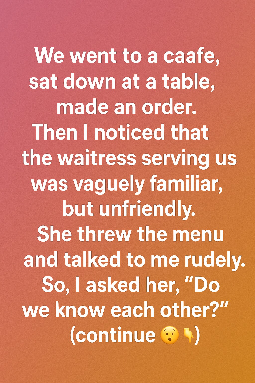 We went to a café, sat down at a table, made an order. Then I noticed that the waitress serving us was vaguely familiar, but unfriendly. She threw the menu and talked to me rudely. So, I asked her, “Do we know each other?” Her expression flickered for only a moment before she quickly looked away, shrugging with an air of indifference. My husband, seated across from me, raised an eyebrow at the exchange but said nothing. I tried to brush it off, convincing myself she was having a bad day, but something about her tone felt pointed—personal. There was a heaviness in her stare, a kind of resentment that didn’t make sense. As she walked away, the familiarity nagged me, like recognizing a song but forgetting the lyrics. I sipped my water, trying to place her face, but the memory stayed just beyond reach.