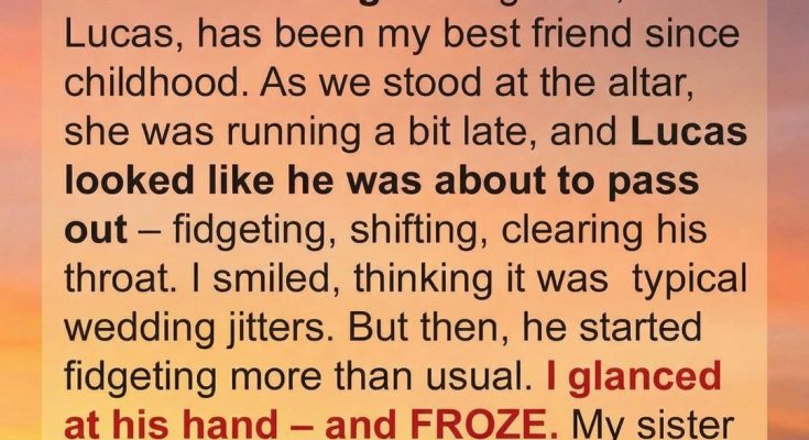 I was the best man at my baby sister’s wedding – her groom, Lucas, has been my best friend since childhood. As we stood at the altar, she was running a bit late, and Lucas looked like he was about to pass out – fidgeting, shifting, clearing his throat. I smiled, thinking it was typical wedding jitters. But then, he started fidgeting more than usual. I glanced at his hand – and FROZE. My sister had just started walking down the aisle. For a second, I didn’t know what to do. Then I blurted, “WAIT! THIS WEDDING CAN’T GO ON!” Everyone turned to me, stunned. So I said, “LUCAS. SHOW YOUR HAND.” My voice echoed through the chapel, and my sister stopped mid-step, clutching her bouquet as her eyes darted between us.
