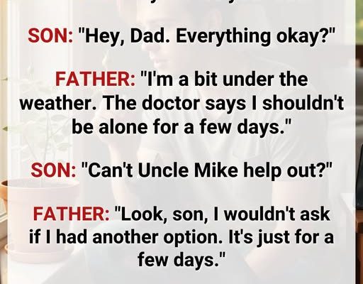 “I’m a bit under the weather. Nothing serious,” he rushed to add, “but the doctor says I shouldn’t be alone for a few days.”