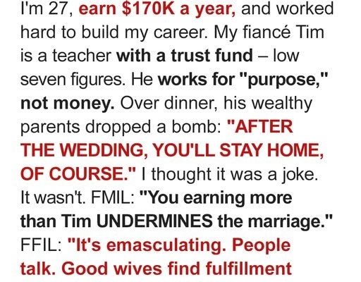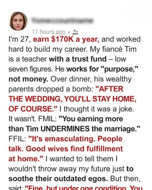 Tim’s father, Arnold, cleared his throat, adjusting his gold cufflinks. “Your career, of course. After the wedding, you’ll stay home.