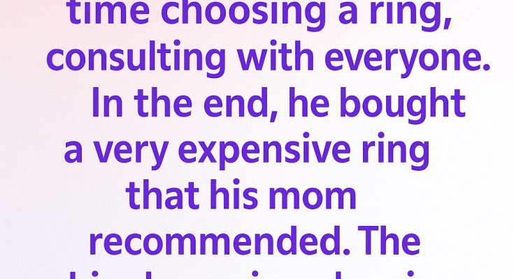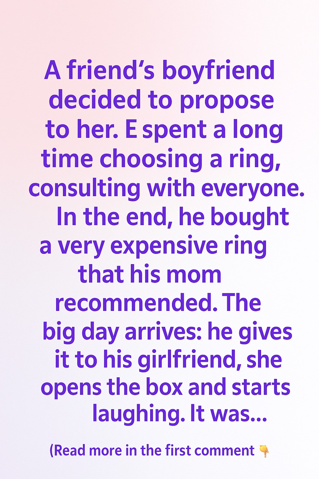 A friend’s boyfriend decided to propose to her. He spent a long time choosing a ring, consulting with everyone. In the end, he bought a very expensive ring that his mom recommended. The big day arrives: he gives it to his girlfriend, she opens the box and starts laughing. It was… not the reaction he expected after weeks of planning and quiet excitement. He had imagined surprise, maybe happy tears, or even a stunned silence—but laughter was the last thing on his list. As she covered her mouth, trying to stifle the giggles bubbling up, he felt confusion and worry rise in his chest. But she reached for his hand almost immediately, asking him gently to sit with her before he assumed the worst. There was something kind in her eyes—warm enough to soften the moment, even though everything felt upside down.