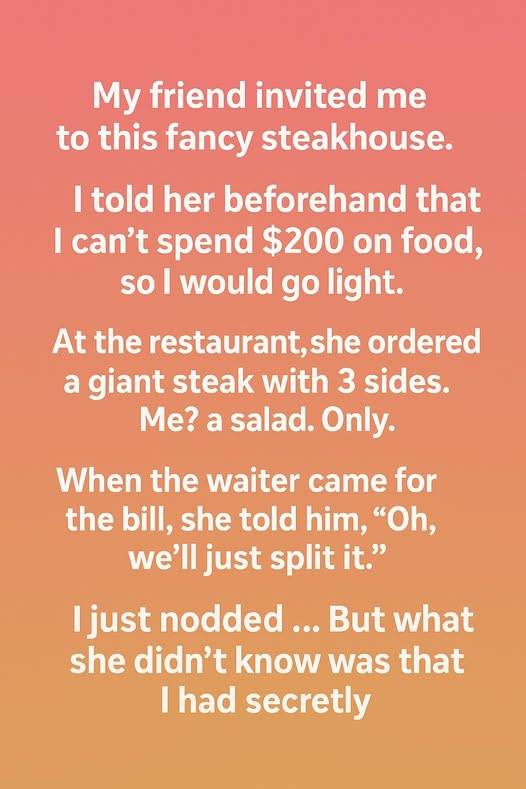 So when the time came, I simply smiled and waited as the waiter placed two bills on the table — one for her meal, and one showing my salad was already paid for. My friend looked surprised at first, then embarrassed. “You could’ve just told me,” she whispered.