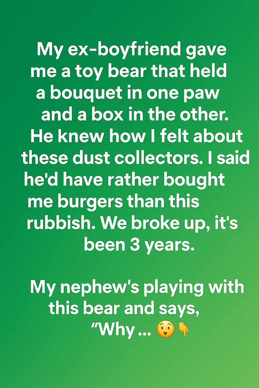 My ex-boyfriend gave me a toy bear that held a bouquet in one paw and a box in the other. He knew how I felt about these dust collectors. I said he’d have rather bought me burgers than this rubbish. We broke up, it’s been 3 years. My nephew’s playing with this bear and says, “Why …“does the bear look like it’s waiting for someone?” His little question caught me off guard. I watched him tilt the bear’s head curiously, as though he sensed a story hidden in its stitched smile. For the first time, I really looked at it—not as an object I had dismissed, but as something someone had once chosen carefully, believing it would make me happy. Three years ago, I misunderstood the intention behind the gift. I saw it as clutter, something impractical, instead of noticing the small effort, the thought, and the kindness behind it. Back then, I was convinced that gestures needed to match my expectations to matter. Now, as my nephew played with the toy, it somehow felt softer, warmer, and more meaningful than it ever had.