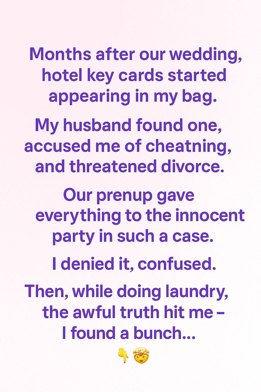 Months after our wedding, hotel key cards started appearing in my bag. My husband found one, accused me of cheating, and threatened divorce. Our prenup gave everything to the innocent party in such a case. I denied it, confused. I had no explanation for how the cards kept showing up, and the more I insisted I had no idea where they came from, the angrier he became. What hurt most was not the accusation itself, but how quickly he believed the worst. I started questioning myself—every moment, every errand, every grocery run—trying to remember if I had somehow picked them up by mistake. But the cards were from hotels I had never visited, and the mystery of it all made our home tense and fragile.