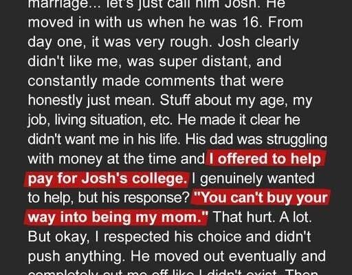 When her hostile stepson cruelly rejected her college fund offer, claiming, “You can’t buy your way into being my mom,” she let him go. Five years later, he calls with big news and a bold request that leaves her reeling.
