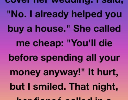 When my daughter Vanessa asked me to pay for her wedding, I refused. “No,” I said calmly. “I already helped you buy a house.” Her response cut deeper than I expected: “You’ll die before spending all your money anyway!”