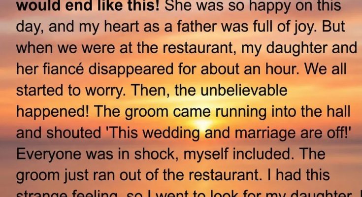 I never imagined my only daughter’s wedding would end like this! She had been glowing all morning, moving through the ceremony with the kind of joy every parent dreams of seeing in their child. As her father, watching her walk down the aisle filled me with pride so overwhelming it was hard to breathe. When we arrived at the restaurant for the reception, everything seemed perfect—laughter, music, family gathered from near and far. But then, my daughter and her fiancé stepped away for what we assumed was a moment of quiet. One hour passed, then nearly two, and worry began to ripple through the room. Just as murmurs started rising, the groom suddenly burst back into the hall, pale and shaken, shouting that the wedding and marriage were off before running out into the night.