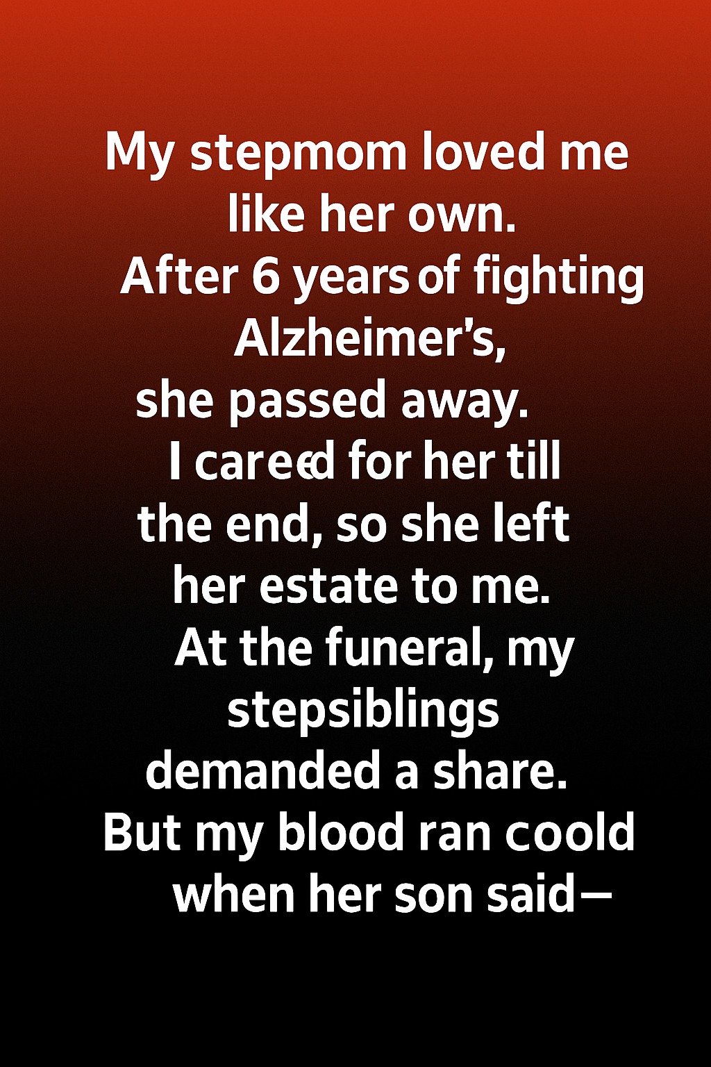 My stepmom loved me like her own. After 6 years of fighting Alzheimer’s, she passed away. I cared for her till the end, so she left her estate to me. At the funeral, my stepsiblings demanded a share. But my blood ran cold when her son said, I didn’t expect the reading of the will to feel like a second funeral, but the tension inside the attorney’s office was heavier than the grief we had shared only days before. I had known my stepmother, Elaine, for most of my life, and although she had married my dad when I was already a teenager, she stepped into the role of a mother gently, never forcing me to accept her but earning my trust through kindness. When Alzheimer’s began to steal her memories piece by fragile piece, I moved in without hesitation. I watched over her through nights when she forgot where she was, mornings when she couldn’t remember her own son’s name, and rare moments of clarity that felt like gifts. When the attorney announced that she had left her home, savings, and personal belongings to me, I felt heartbreak more than relief. I hadn’t cared for her for inheritance—I cared for her because she had cared for me.