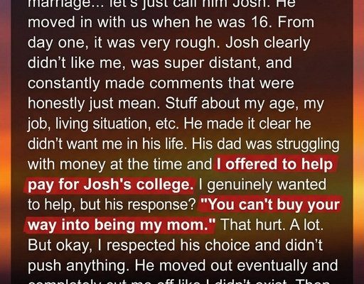 My husband has a son from his previous marriage… let’s just call him Josh. He moved in with us when he was 16. From day one, it was very rough. Josh clearly didn’t like me, was super distant, and constantly made comments that were honestly just mean. Stuff about my age, my job, living situation, etc. He made it clear he didn’t want me in his life. His dad was struggling with money at the time and I offered to help pay for Josh’s college. I genuinely wanted to help, but his response? “You can’t buy your way into being my mom.” That hurt. A lot. But okay, I respected his choice and didn’t push anything. He moved out eventually and completely cut me off like I didn’t exist. Then out of nowhere, five years later, he calls me. I still remember that moment—my phone lit up with a number I hadn’t seen in years, and for a second, I just stared at it, unsure whether to answer. When I finally picked up, his voice sounded nothing like the sharp teenager who’d once kept a wall between us. He sounded hesitant, quiet, even nervous. He apologized for reaching out so suddenly and said he hoped I didn’t mind him calling. Before I could decide what to feel, he added softly, “I need to talk to you.” There was no anger, no sarcasm, only sincerity. And hearing that shift cracked open something in me I hadn’t realized I’d been holding for years—an ache shaped like an unreturned effort to connect.