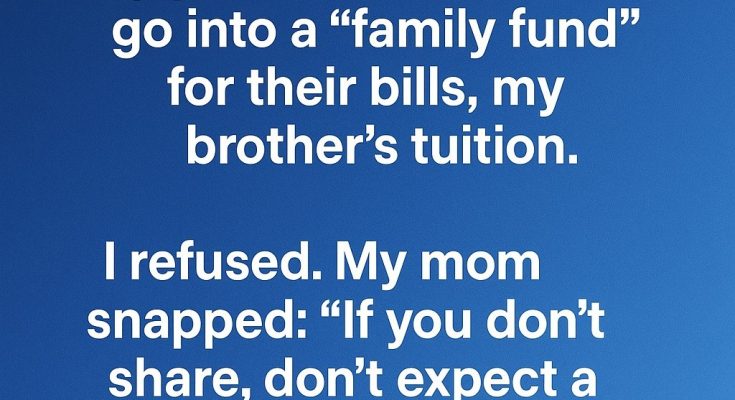 When my Grandpa passed on, he left me money. My parents insisted it should go into a “family fund” for their household expenses and my brother’s tuition. I chose not to agree, and my mom reacted with frustration, telling me that I wasn’t being supportive.