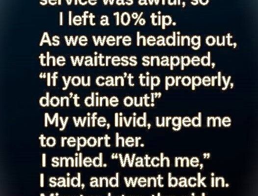 My wife and I went out to eat, and the service was awful. Frustrated, I left a 10% tip. As we headed for the door, the waitress snapped, “If you can’t tip properly, don’t dine out!” My wife was furious and demanded I report her.