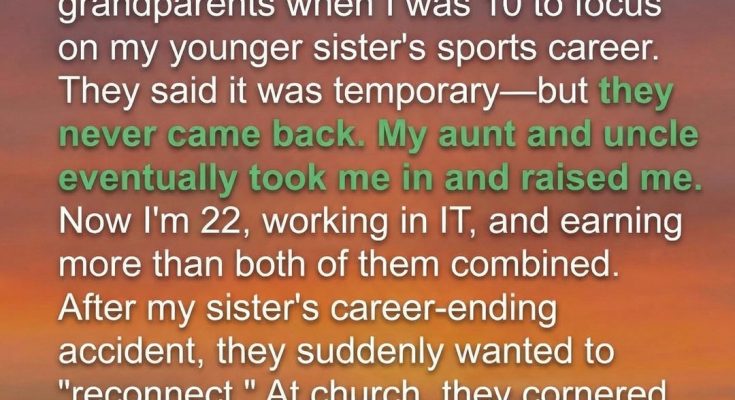 My parents left me with my grandparents when I was 10 to focus on my younger sister’s sports career. They said it was temporary—but they never came back. My aunt and uncle eventually took me in and raised me. For years, I learned to stop waiting for apologies that never arrived and built a life from the scraps they left behind. By the time I turned 22, working steadily in IT and finally earning enough to help my aunt and uncle the way they once helped me, I believed the past had settled into something quiet—something I no longer needed to revisit.