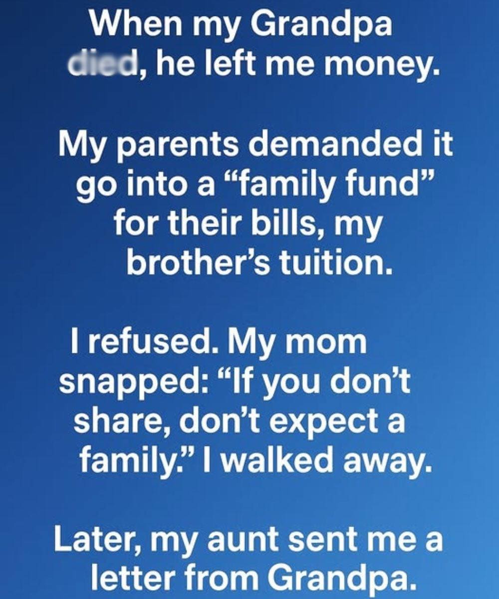Almost immediately, my parents suggested it should go into a “family fund” to help with household bills and my brother’s college costs. They insisted it was the sensible, mature choice and when I hesitated, their disappointment felt like a weight on my chest. I’d always been the accommodating one, the peacemaker, the child who never wanted to cause trouble. But something about this inheritance felt different, almost personal… as if it carried a purpose only he and I would understand. Feeling overwhelmed, I stepped back from the argument.